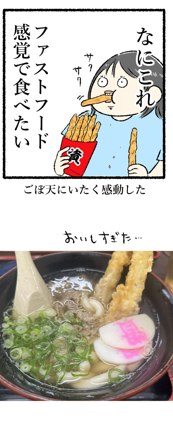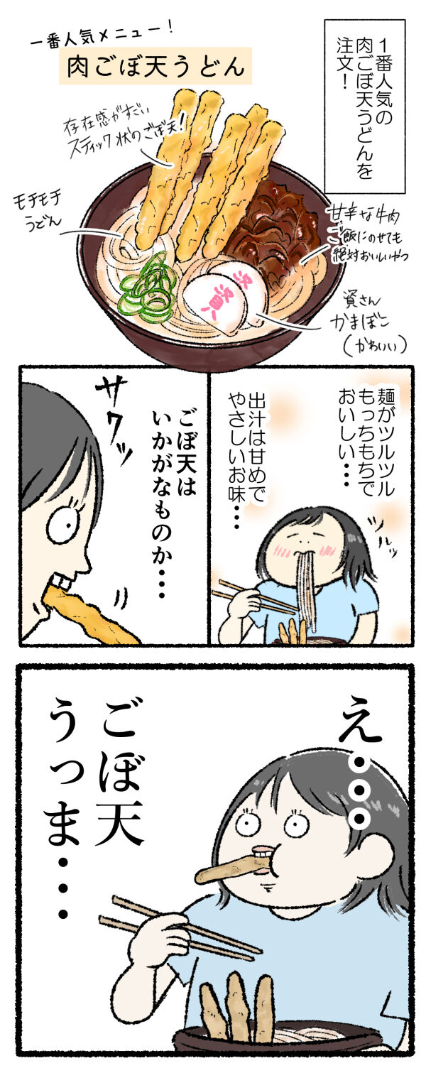 注文したのはごぼ天うどん!麺がモチモチでめっちゃおいしい!特に感動したのがごぼ天。