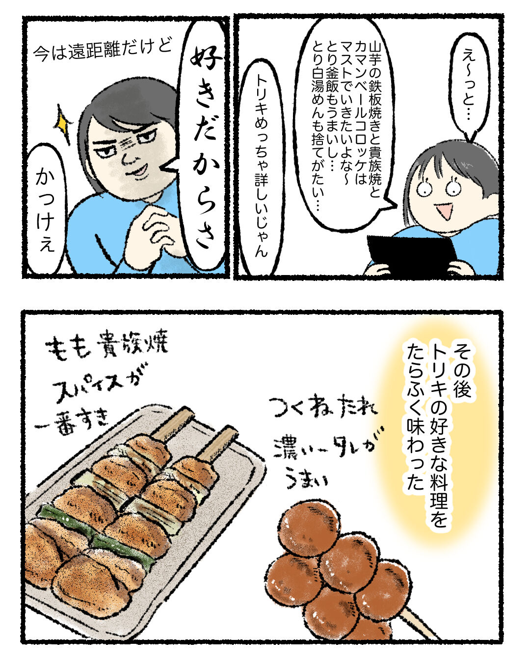 トリキを熱望した結果 2025年02月20日 先日念願のトリキに行ってきました。関東に住んでいた頃はトリキに困らなかったけど、広島に引っ越してからトリキ難民になりました。特に都内はトリキだらけですごかったな。トリキは安くて美味しいの極み…チェーンの居酒屋で1番好きかもしれん。トリキ漫画描いてたら食べたくなったので夕飯は焼き鳥にしますわ。推しチェーン店漫画描くの好きだからまたなんか描きまーす! 「食べ物」カテゴリの最新記事 タグ :#トリキ#鳥貴族 < 前の記事次の記事 >